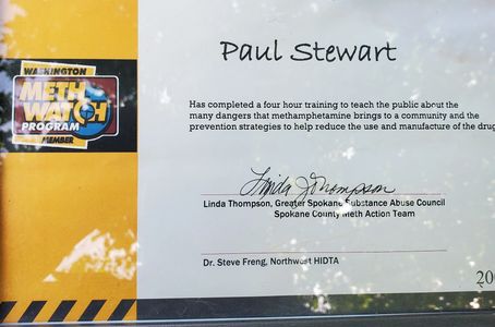 Paul Stewart completed a four hour training to teach the public about the dangers that methamphetamine brings to a community and the prevention strategies to help reduce the use and manufacture of the drug and how it affects Economic Development in your community. As the Director of the East Lewis County Regional Chamber of Commerce, his Chamber was the only Chamber of the County to participate. Therefore is on the Original Lewis County Meth Task Force as an administrator of its initial start-up.