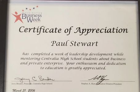 Advisor with the Washington State Business Week Program in Lewis County, (Centralia High School) while Executive Director, East Lewis County Regional Chamber of Commerce.
